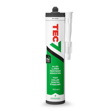 Al meer dan 20 jaar is TEC7 de meest gekende kit om te lijmen, afdichten en bevestigen. Als het écht goed moet zijn, grijpen vakmensen en gevorderde klussers naar de koker TEC7. En terecht!TEC7 is de eerste keuze voor 80% van alle toepassingen. TEC7 vervangt montagelijm, houtlijm, PU-lijm, siliconenkit, acrylaatkit, ...· zeer goede hechting op bijna alle ondergronden· tast geen kunststoffen, piepschuim en spiegels aan· sterk UV-bestendig· bloedt niet uit op natuursteen· schimmelbestendig· zeer goed toepasbaar op vochtige ondergrond, zelfs onder water· overschilderbaar met de meeste verven· bestand tegen zout water