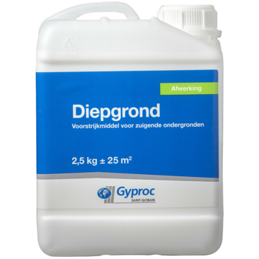 Gyproc Diepgrond is een kostenbesparend, diep indringend voorstrijkmiddel op waterbasis voor zuigende en verpoederde ondergronden. Gyproc Diepgrond bindt stof en vermindert de zuigende werking, waardoor bespaart wordt op verf, latex en behanglijm. Bovendien zorgt diepgrond ervoor dat verpoederde ondergronden worden gestabiliseerd.